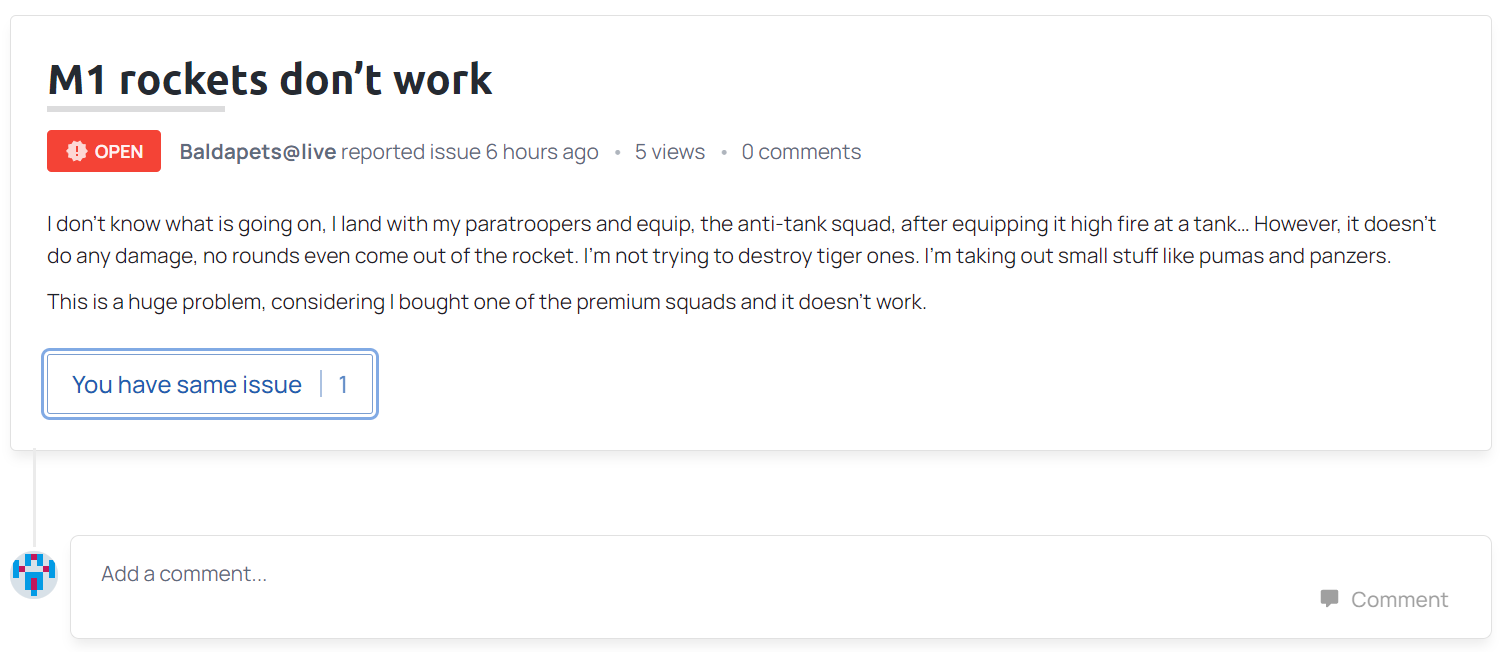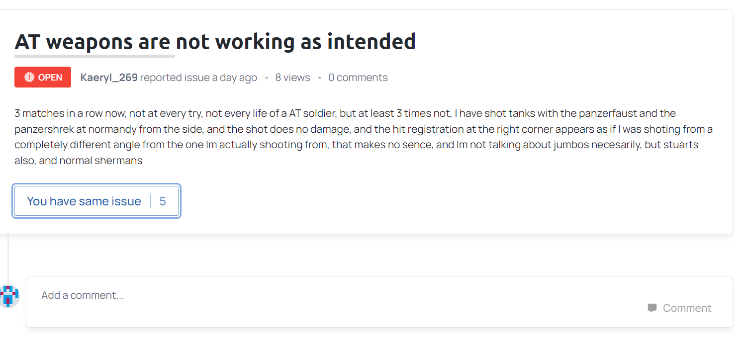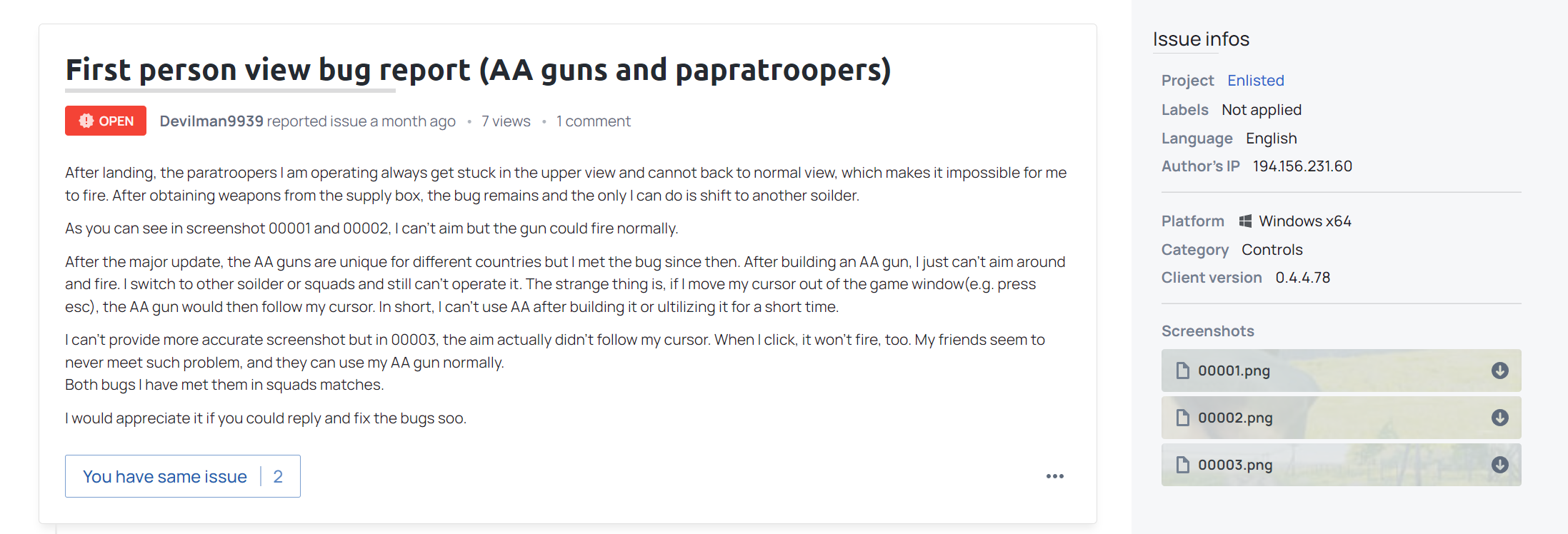 I really hope that the ‘issues’ community could be more active and effective. I reported a rare bug of first-person view of AA, AT and paratroopers a month ago with valid screenshots. No reply.
