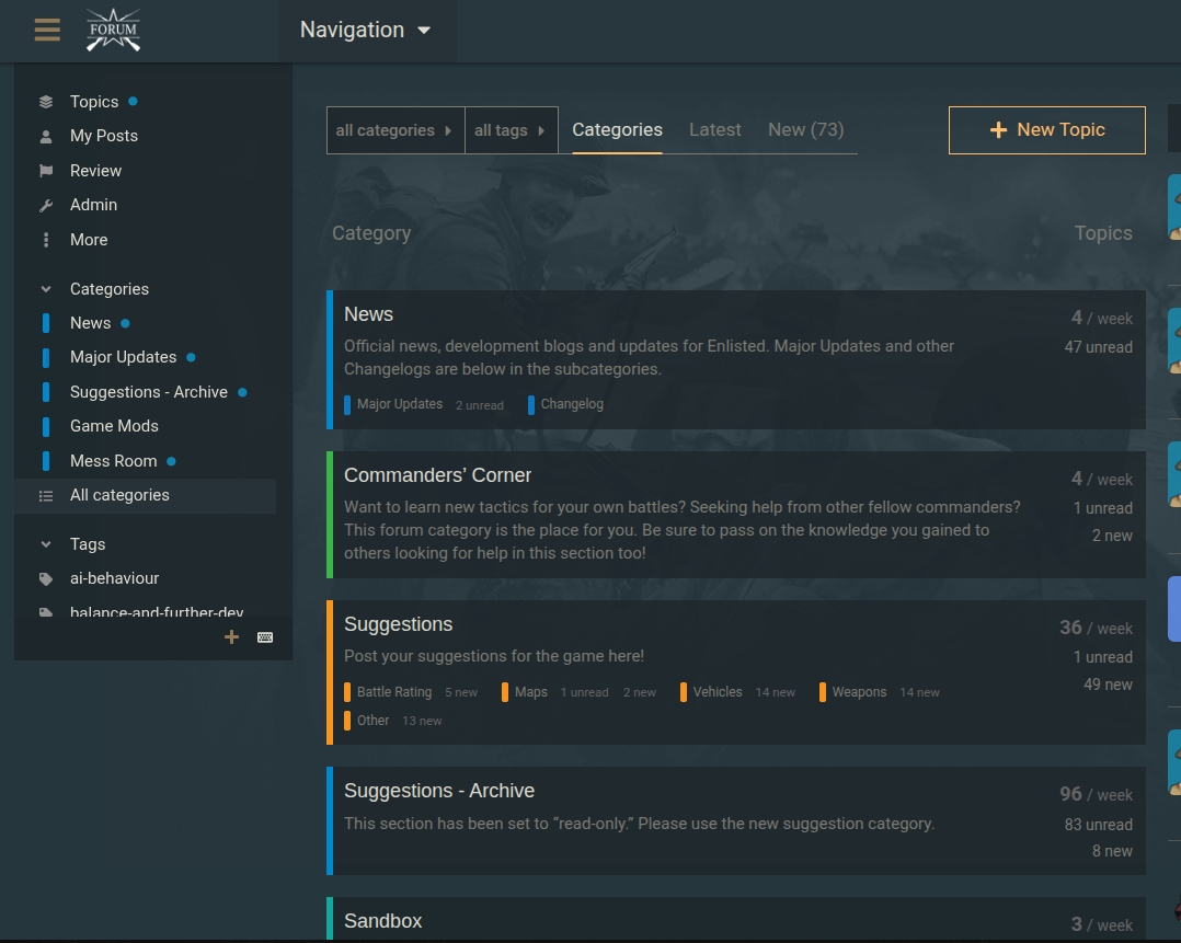 I just went to forum.enlisted.net and it goes straight to the main page that clearly shows the new suggestions option. I didn’t need to click anything else.