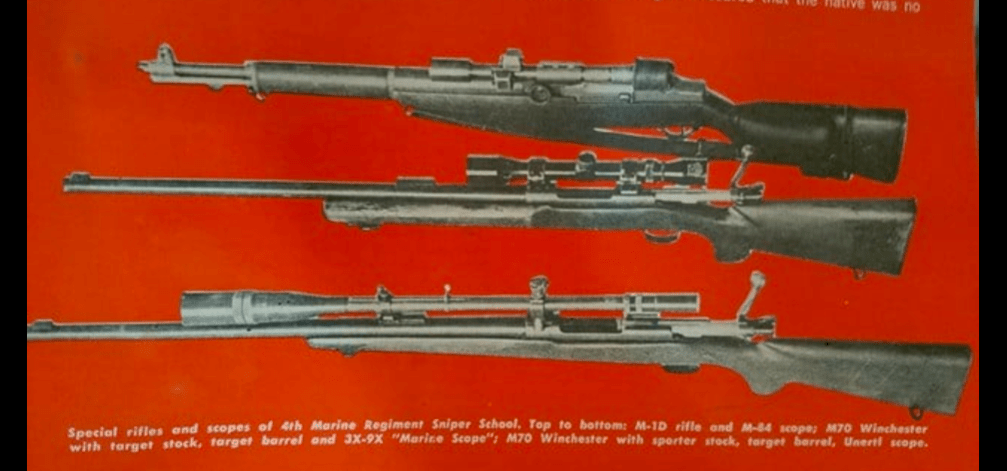 The United States Marine Corps purchased 373 Model 70 rifles in May 1942. Although the Marine Corps officially used only the M1 Garand and the M1903 Springfield as sniper rifles during the Second World War, “many Winchester Model 70s showed up at training camps and in actual field use during the Pacific campaign.”[41] These rifles had shorter 24-inch barrels chambered for .30-06 Springfield. They were serial numbered in the 41,000 to 50,000 range and were fitted with leaf sights and checkered stocks with steel butt plates, one-inch sling swivels, and leather slings.