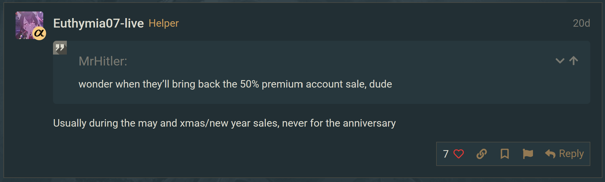 Anywho, I would like to ask if anyone knows when or if there will be any discounts on premium time in the near future? I thought Black Friday would have brought some good deals on premium time but I didn’t see anything remotely close to it.