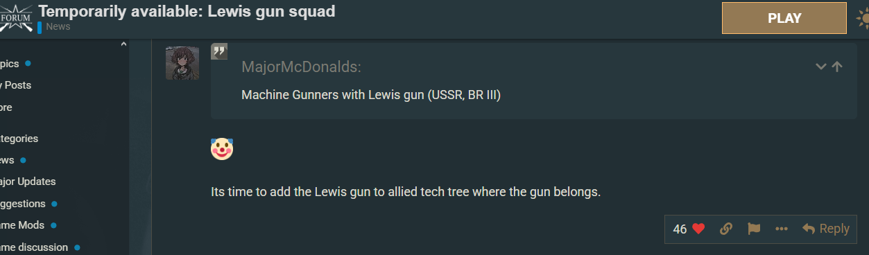 The Lewis gun has been highly requested to be added to the Allied tech tree in the past two years, it’s a very iconic weapon that saw extensive use by Commonwealth forces in both world wars and would fit in BR3 perfectly, giving Britain its own LMG on the BR instead of having to rely on US BARs.
