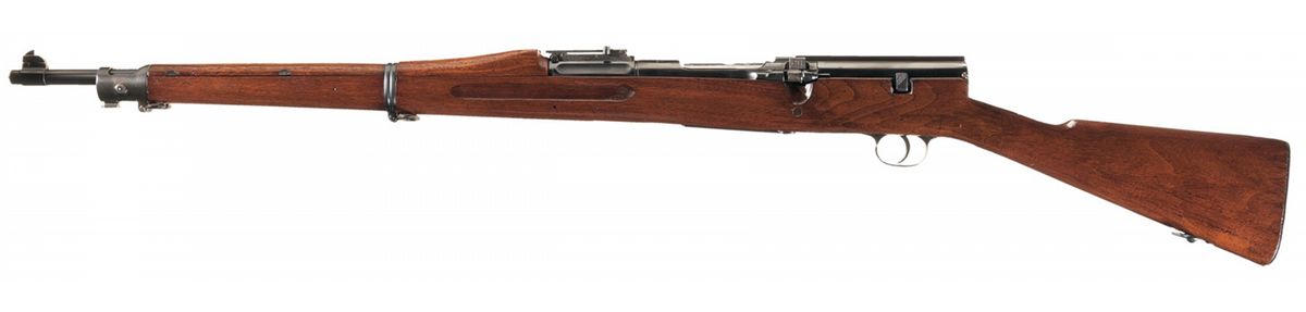 Experimental and possibly one of a kind semi-automatic rifle built on a Model 1903 Springfield Action. This rifle, serial no. 389864, is illustrated and briefly described on pages 6 and 7 of “THE GAS TRAP GARAND” by Billy Pyle. The caption describes this rifle as an “enigmatic M1903 conversion, inventor unknown. This rifle, which has a fixed barrel and no gas system, appears to be primer-actuated.” The rifle has a standard Model 1903 barrel, rear sight, upper and lower barrel bands, buttplate and front sight. The barrel and receiver have standard Model 1903 Springfield markings; the barrel is dated “1-10”. The bolt, receiver, trigger guard and stock have been extensively modified. The receiver has been extended by approximately six-inches to accommodate the modified bolt. A seven inch section of walnut has been added between the original Model 1903 buttstock and forearm to fit the extended receiver.