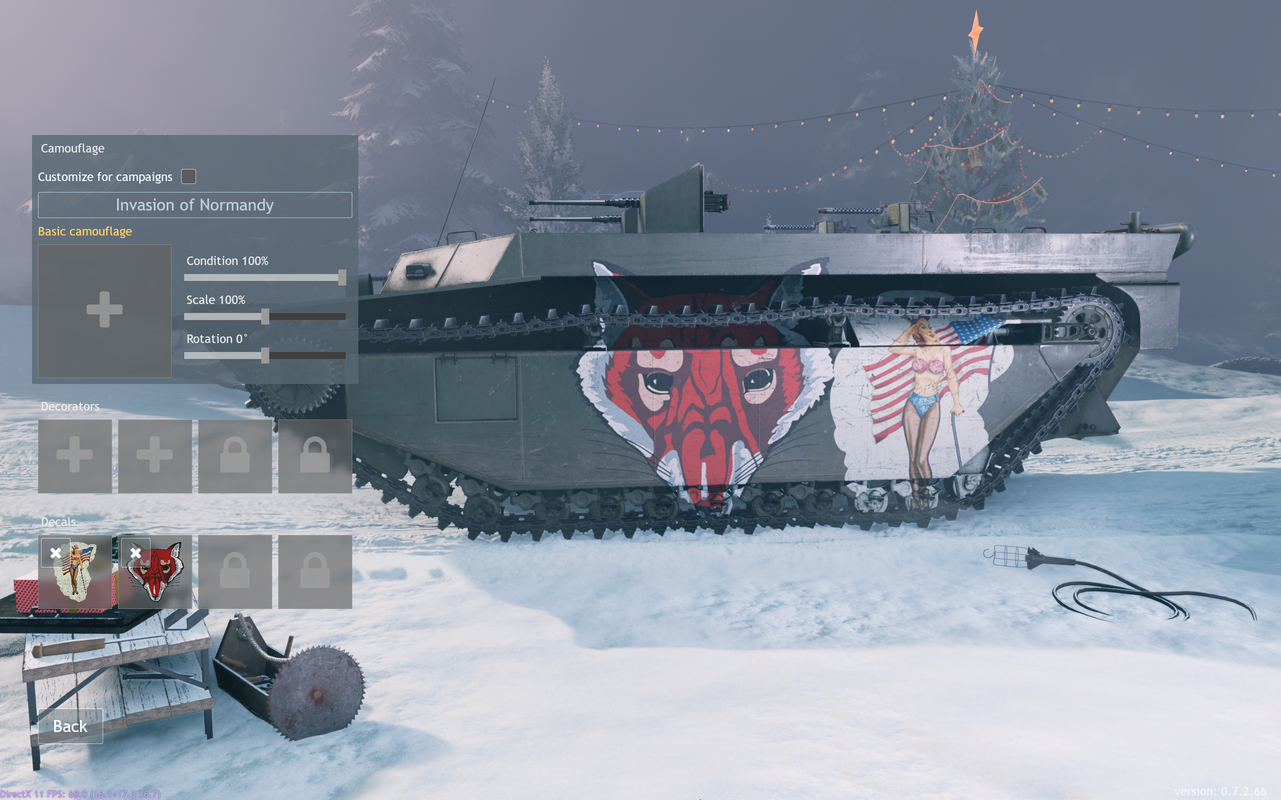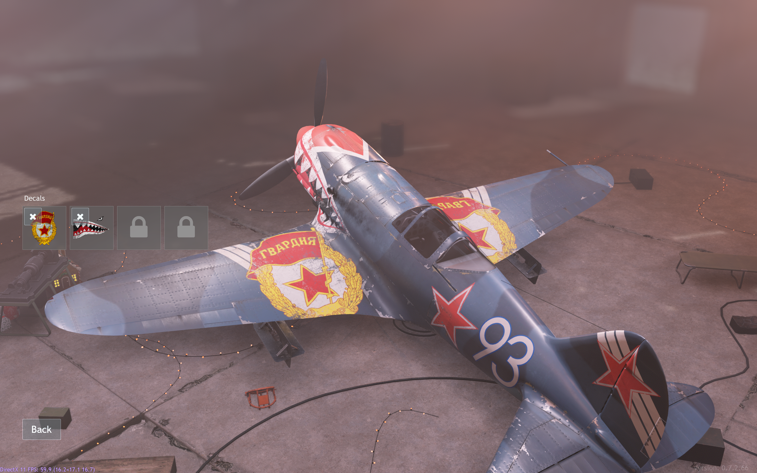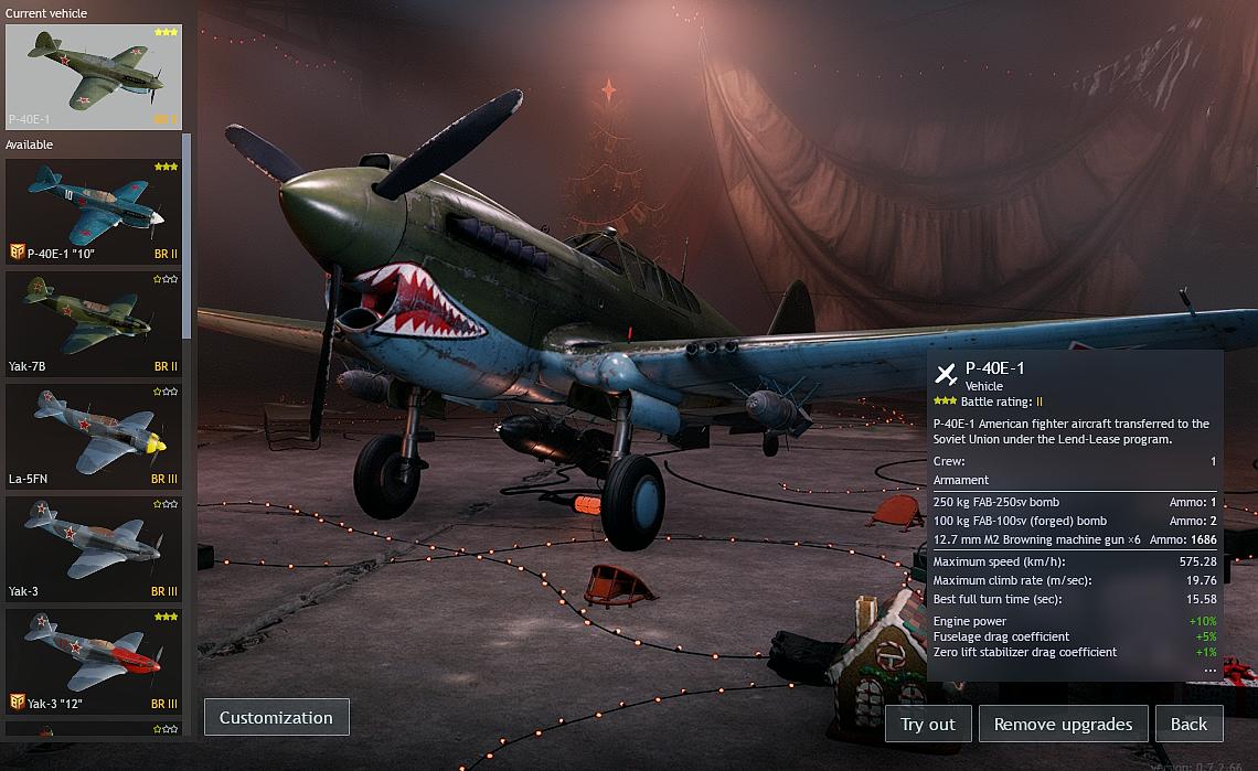 I don’t have much as far as vehicle customization, however, I did give my Soviet P-40 the Flying Tigers look.