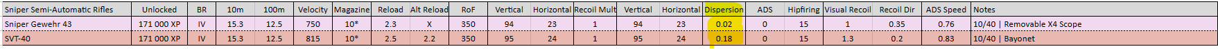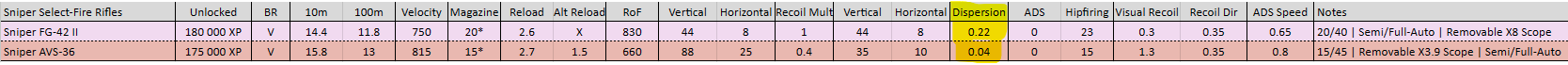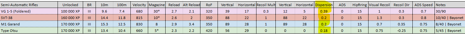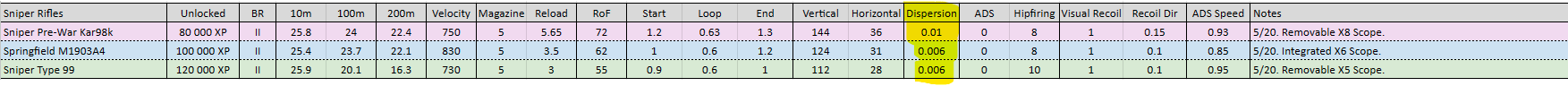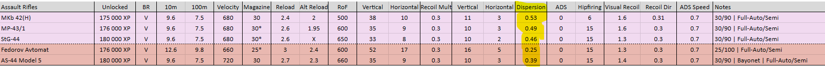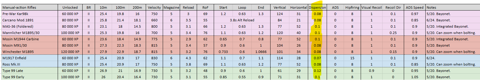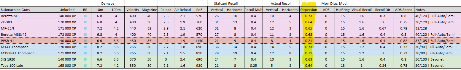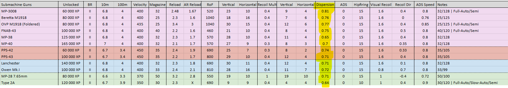 The small arms sheets are organized two ways. Side-by-side for the same BR, or categorized by what class can use them.