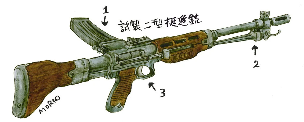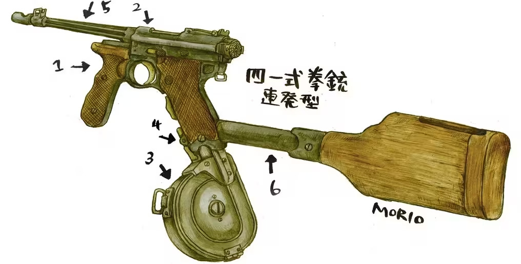 During testing, the cartridge itself was reportedly rejected for being too powerful for a submachine gun (well, that makes sense). But this drawing is my imagination of what might have been if they had managed to develop a firearm robust enough to handle it. In short, it’s a lighthearted, fictional “what-if” scenario. I imagined that perhaps by adding a locking mechanism around the barrel (in the drawing, I used one similar to the Type 94 pistol) and a compensator at the muzzle like the Type 100, they might have made it work.