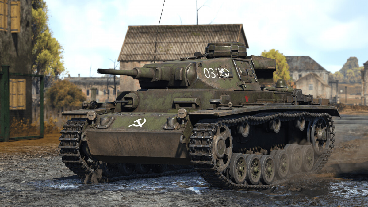 The Soviet T-III , Being a copy of the German Panzer III J (or in this case, captured tank pressed into service) boasts a decently powerful 50 mm gun, which allows it to engage even the most heavily armoured combat vehicles encountered in BR I-II. Its decent mobility allows it to both keep up with Infantry, supporting them with fire, and to take up advantageous firing positions. One of the tank’s key drawbacks is its mediocre survivability: the crew is compactly arranged, and the upper glacis plate and sides are easily penetrated. Therefore, for increased protection, the tank should be angled with a corner towards the enemy.