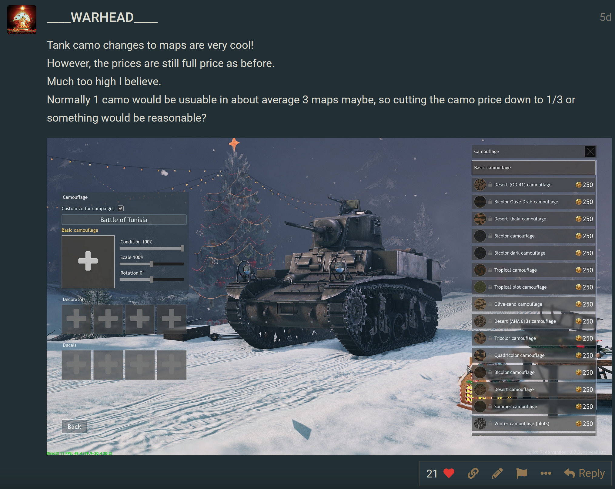 In fact, the new tank camo system is nearly identical to something simple I suggested 7 months ago, which also remained unanswered, yet seems to be implemented now.