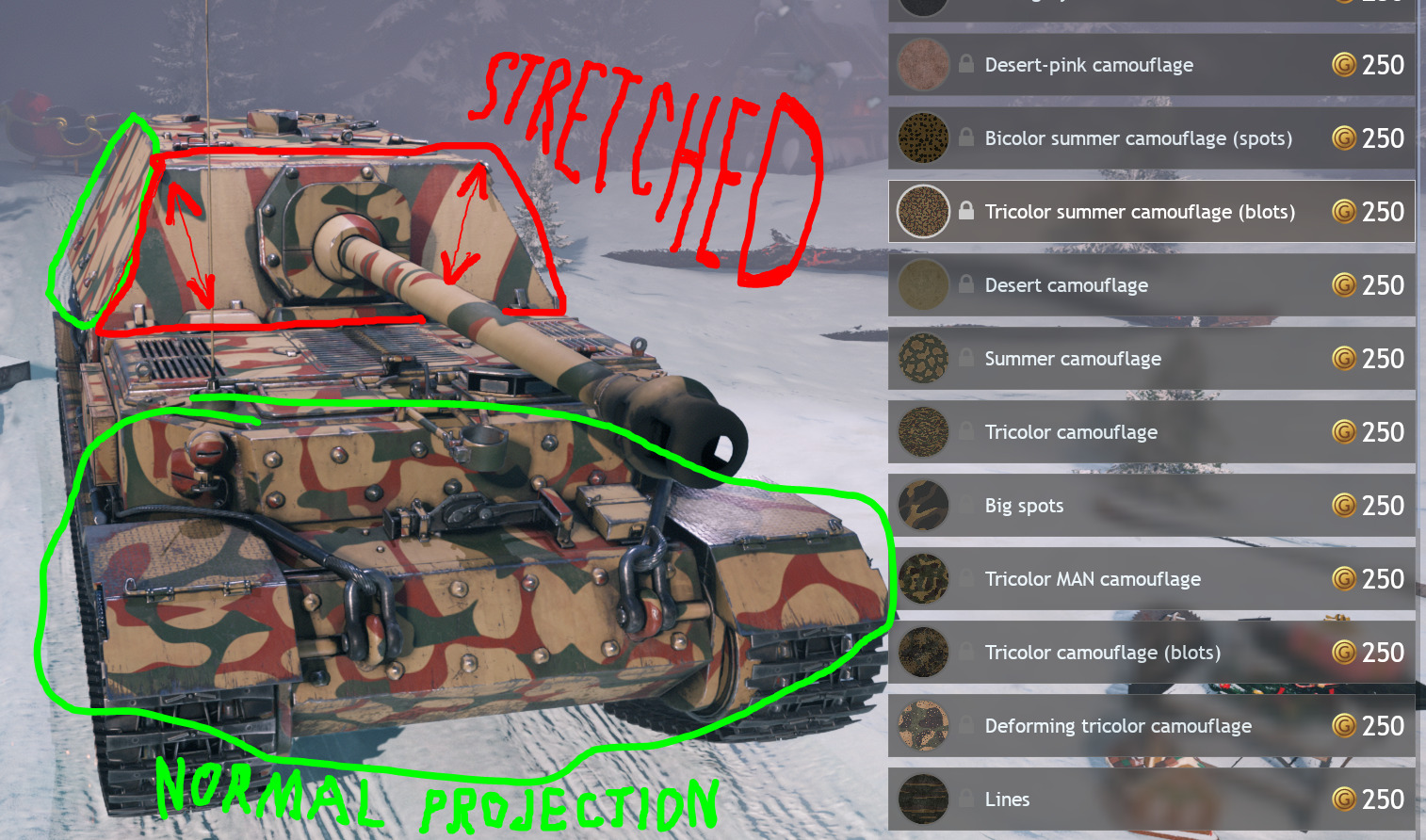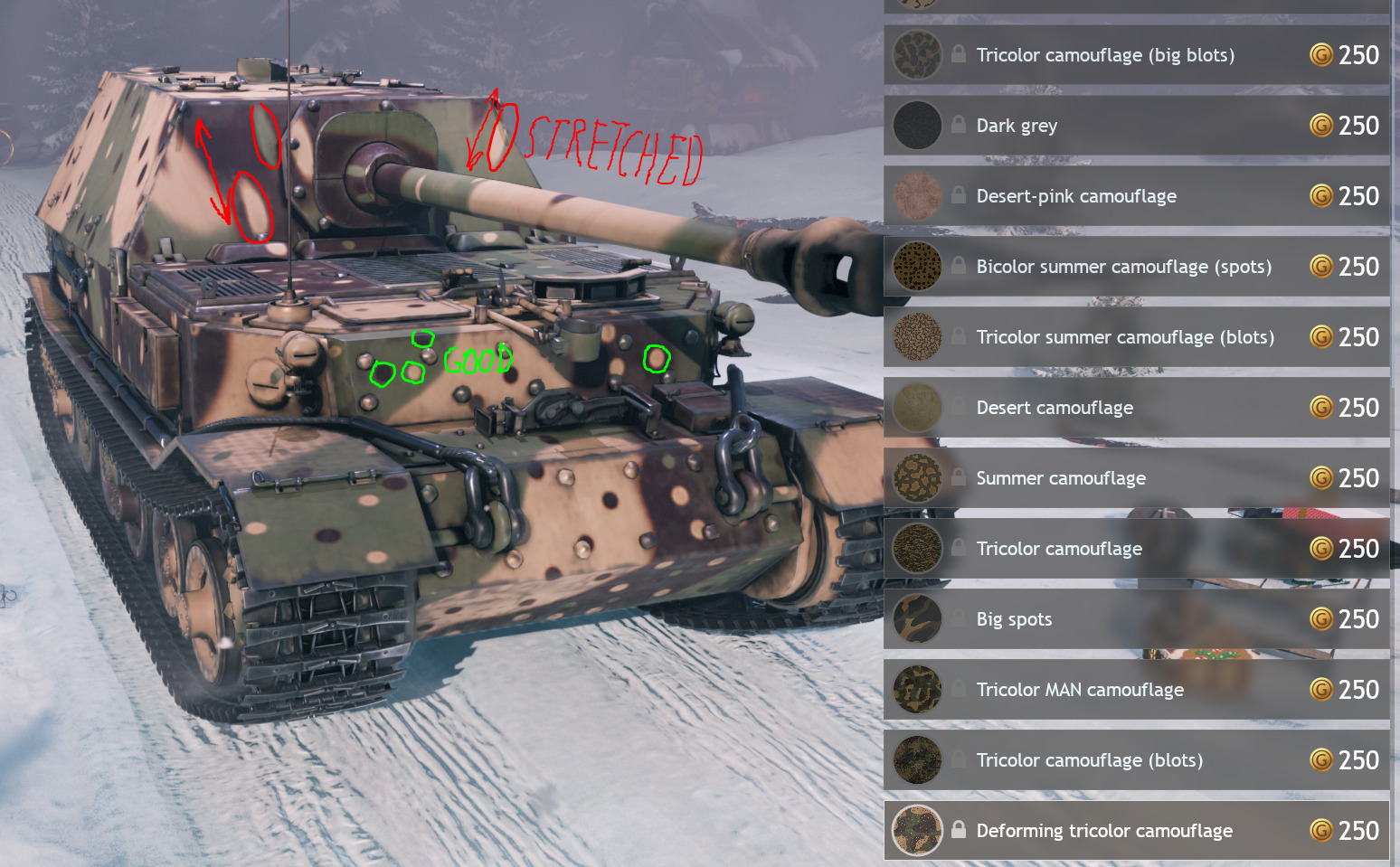 The Ferdinand has a horrible texture projection on the front wall of the crew compartment. This is a similar case to the Sd. KfZ. 234/3, which I pointed out some time ago. The vehicles need their UV maps fixed.