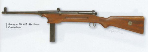 In 1940, the Kuzki brothers designed a submachine gun called ZK-403, which used a 9mm Parabellum caliber instead of the Czech-style 9mm Browning short round. Since Czechoslovakia had already fallen, the design of the ZK-403 did not take into account the use by the Czech army but only considered export. The ZK-403 was showcased in Spain, but it did not receive much attention and the weapon never moved beyond the prototype stage.