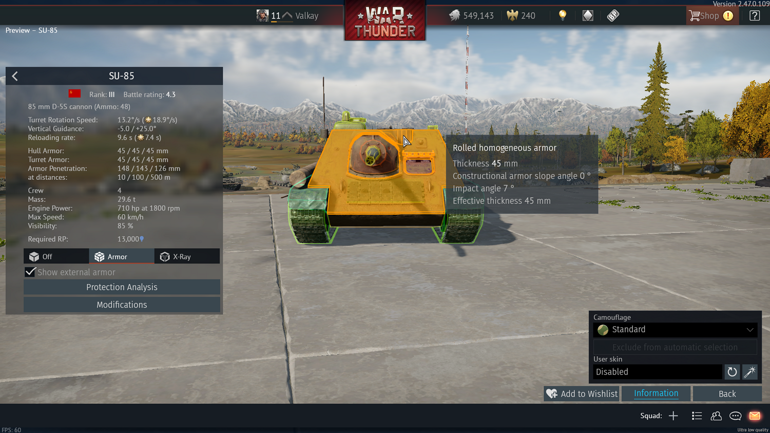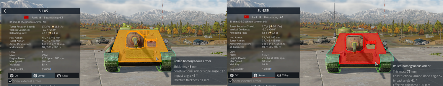 The SU-85 was a Russian tank destroyer that was built around the new D-5T tank gun, made as a stopgap while a new model of T34 was being designed to accommodate the much bigger cannon than the comparatively small F-34 cannons common on T34s. This vehicle is not to be confused with the SU-85M, a later development of the SU-85 we have in game, as there are some key differences between the two. While the Su-85M has much thicker armor, 75mms thick and heavily angled, which puts it 100+ mms thick effectively, the SU-85 has a much thinner hull of 45mms thick and at the same angle, which is the same as normal T34s since it uses the same chassis, with around 65mms of effective armor. In addition, there are two weak spots that will allow BR2 tanks to fight it without it being completely invulnerable; the slight bulge in the armor top left of the mantlet is 45mms thick and the cupola is 20mms thick. I think that this would be a good BR3 vehicle, with a BR4 gun and BR3 armor with a few weak spots. Here are some images below of the armor, credit to @Valkay taken from his older post on the same vehicle (Su-85) since I can’t get my screen to zoom into the vehicle better for whatever reason.