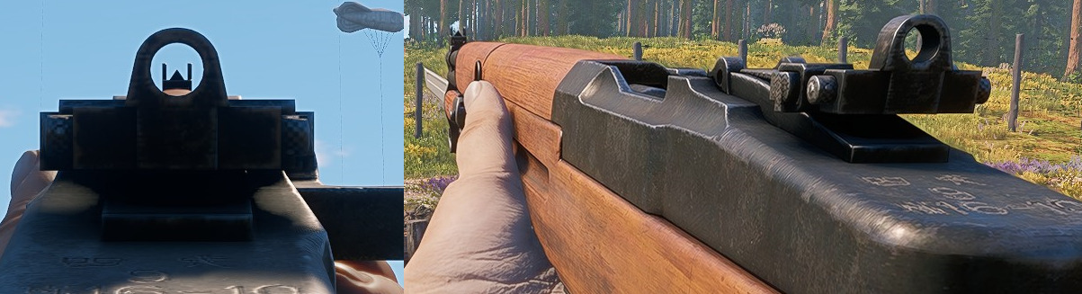 The front sight should be changed to be like the Type 2 SMG front sight that is just a single post for better clarity for the user