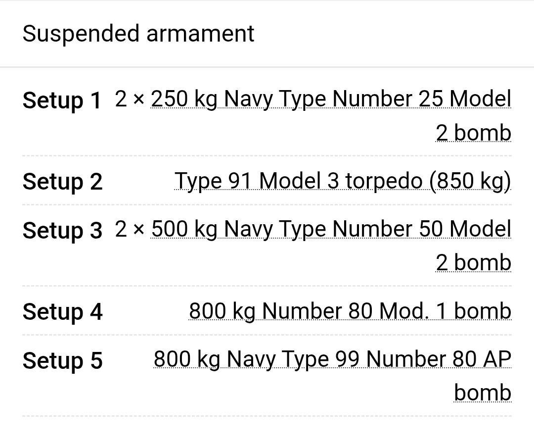 This plane’s internal bomb bay can carry a variety of bombs, one option is a pair of two 250kg bombs, although this would be a huge dissapointment for it to have these when the Ki-100 would have the same payload but better in every way. However, this plane could also mount two 500kg bombs or even the 800kg bomb as seen on the Kikka, which these would, in my opinion be much better.