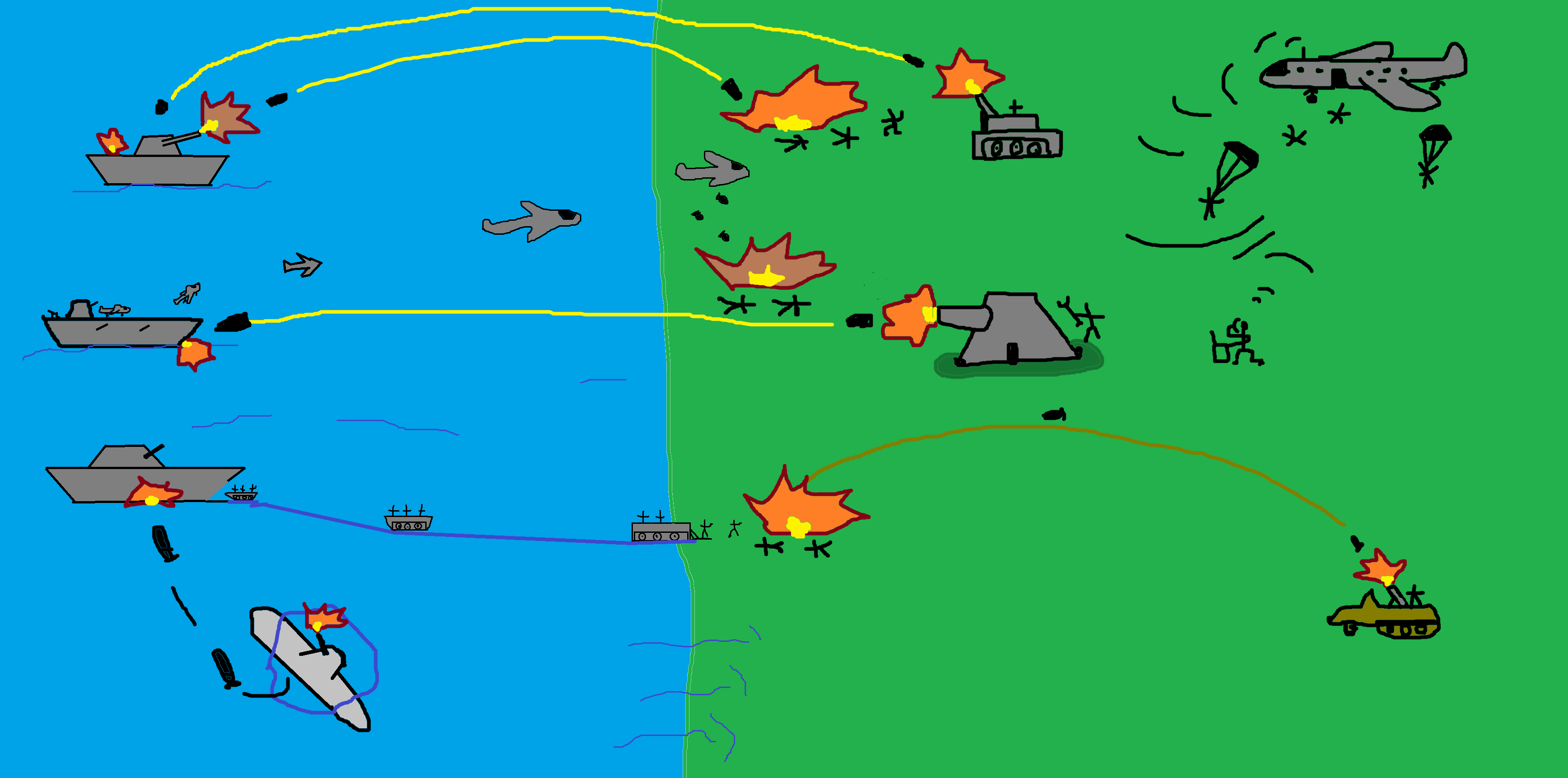 In this image, a German heavy 200mm mobile howitzer fires at the first battleship, a German heavy 200mm gun in a concrete bunker built by an engineer fires at the aircraft carrier in the center of the image, and a German submarine hits a landing ship below. Elsewhere, a German mobile mortar fires at the landing troops. The radio operator calls for a large aircraft, from which the players can bail out because their numbers are dwindling.