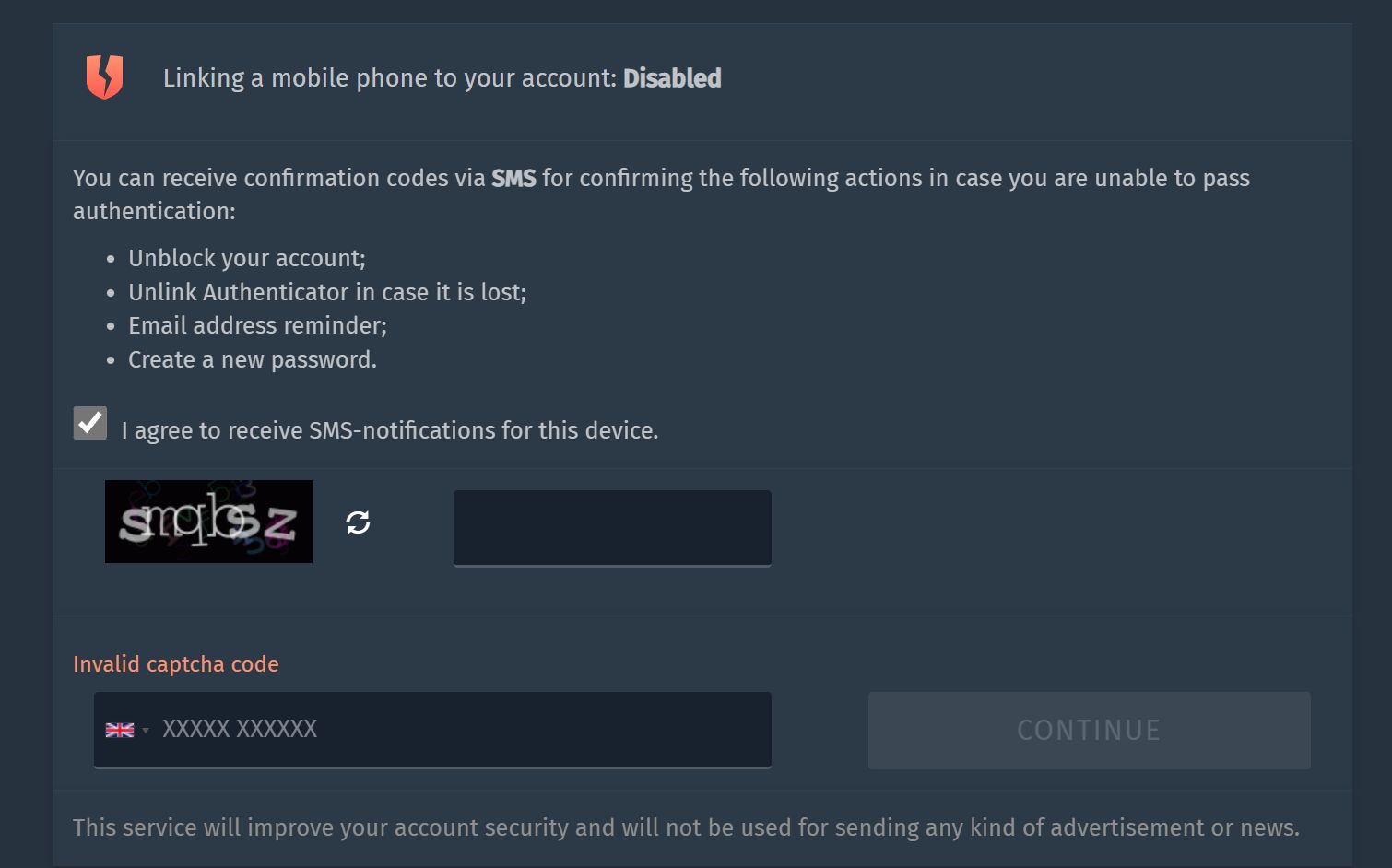 I have been trying to get my two factor thing set up and I can not get past this screen it never takes the captcha code, or it says cant send the sms atm.