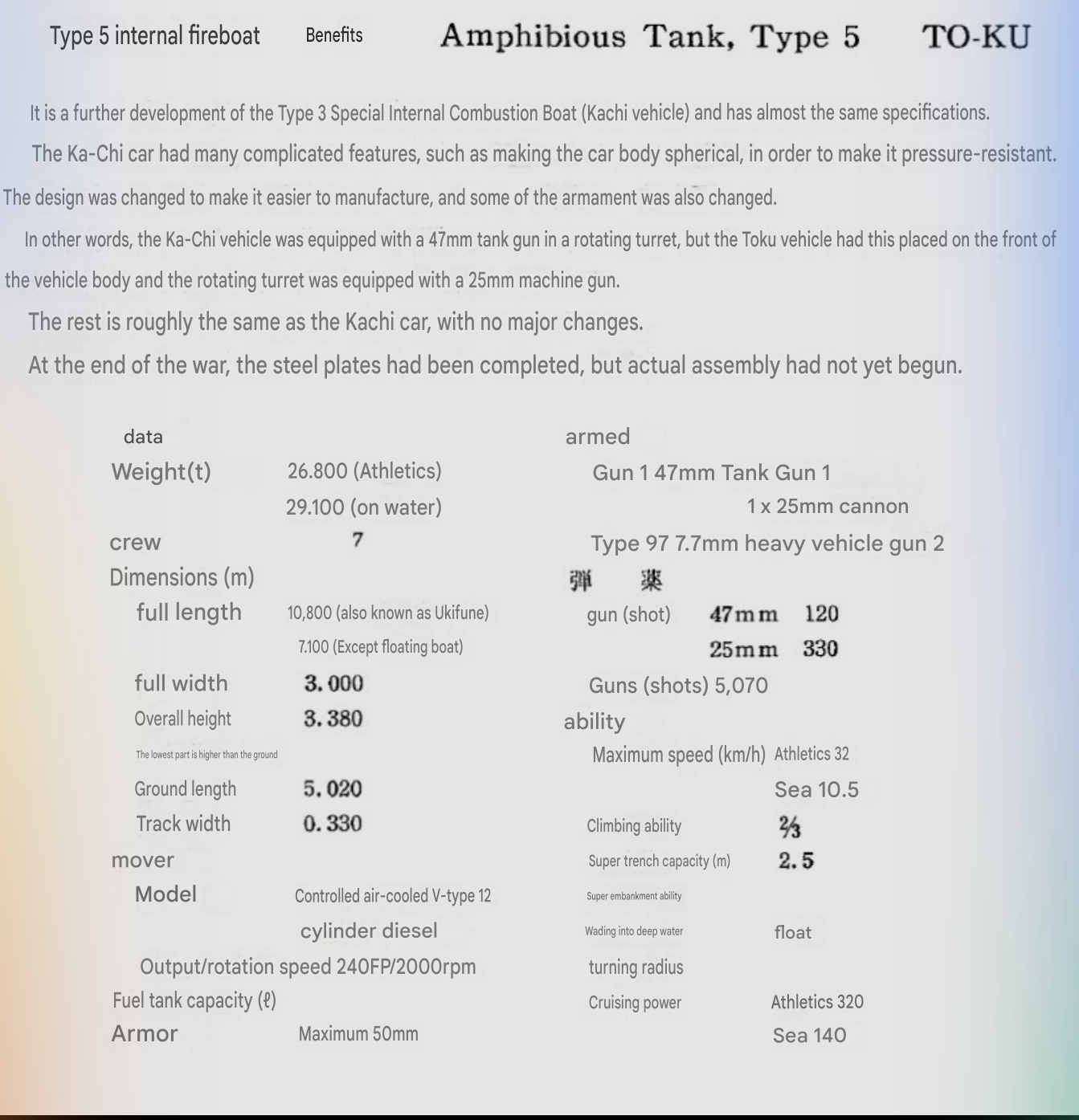 The Type 5 To-Ku Amphibious Tank was intended to be the final Amphibious Tank project of the Imperial Japanese Navy.