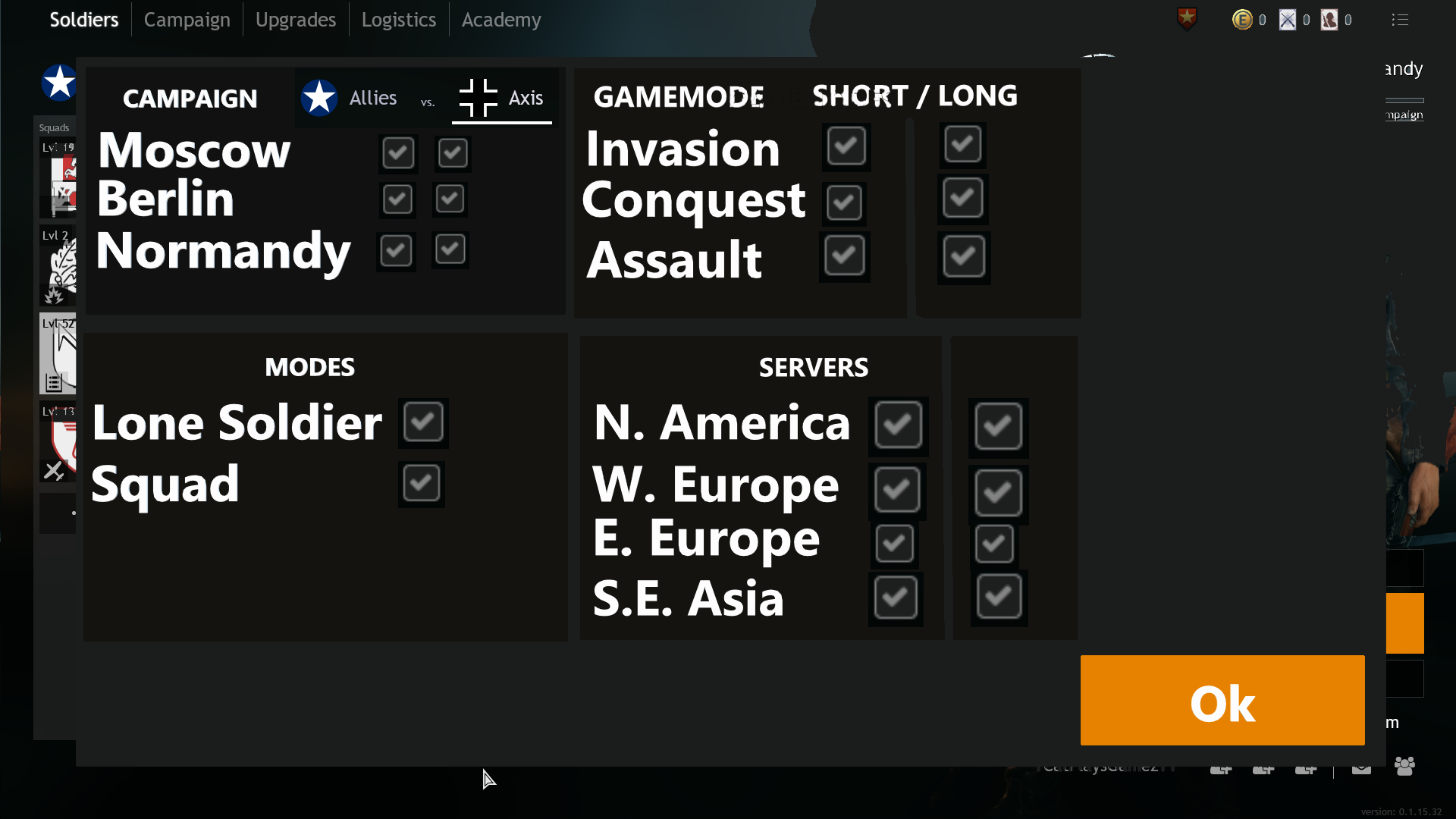 Allow players to select any combination of campaigns and nations to play on, instead of only “one or both nations of one campaign”. This way, players who simply want to play Axis on any campaign, can do so, or filter out the ONE campaign/nation they do not want to play. Additionally, adding quick-swap buttons with symbols in the campaign tab to quickly check your progression between different campaigns would be a huge quality of life improvement, but that should be reserved to a thread of its own.