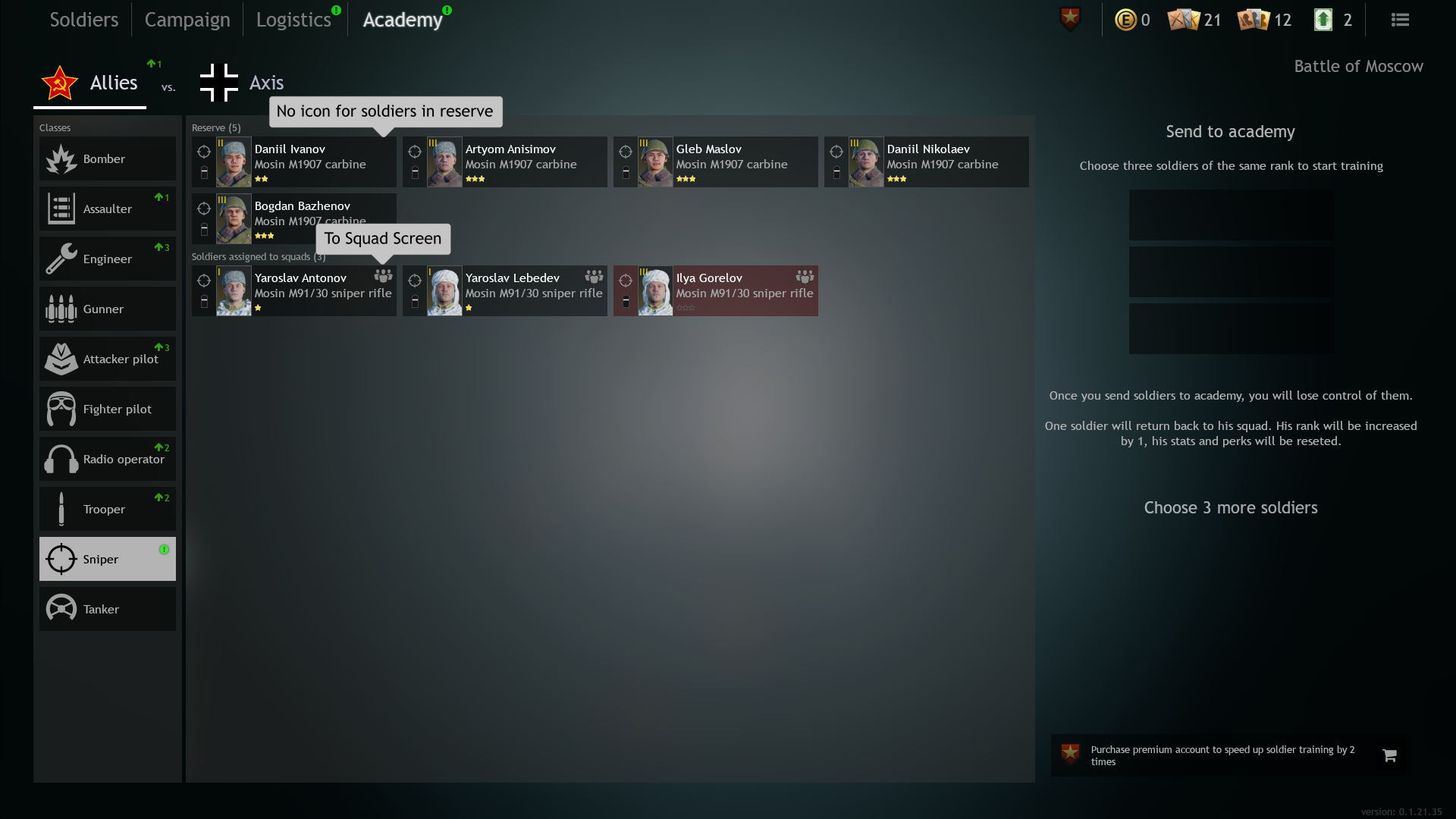 Devs, please make it possible to have empty squads. You can’t select it for battle (UI would display an error message), but you can move all the soldiers from any given squad (except the ones selected for battle) to the reserve with a click of a button. Your players will thank you