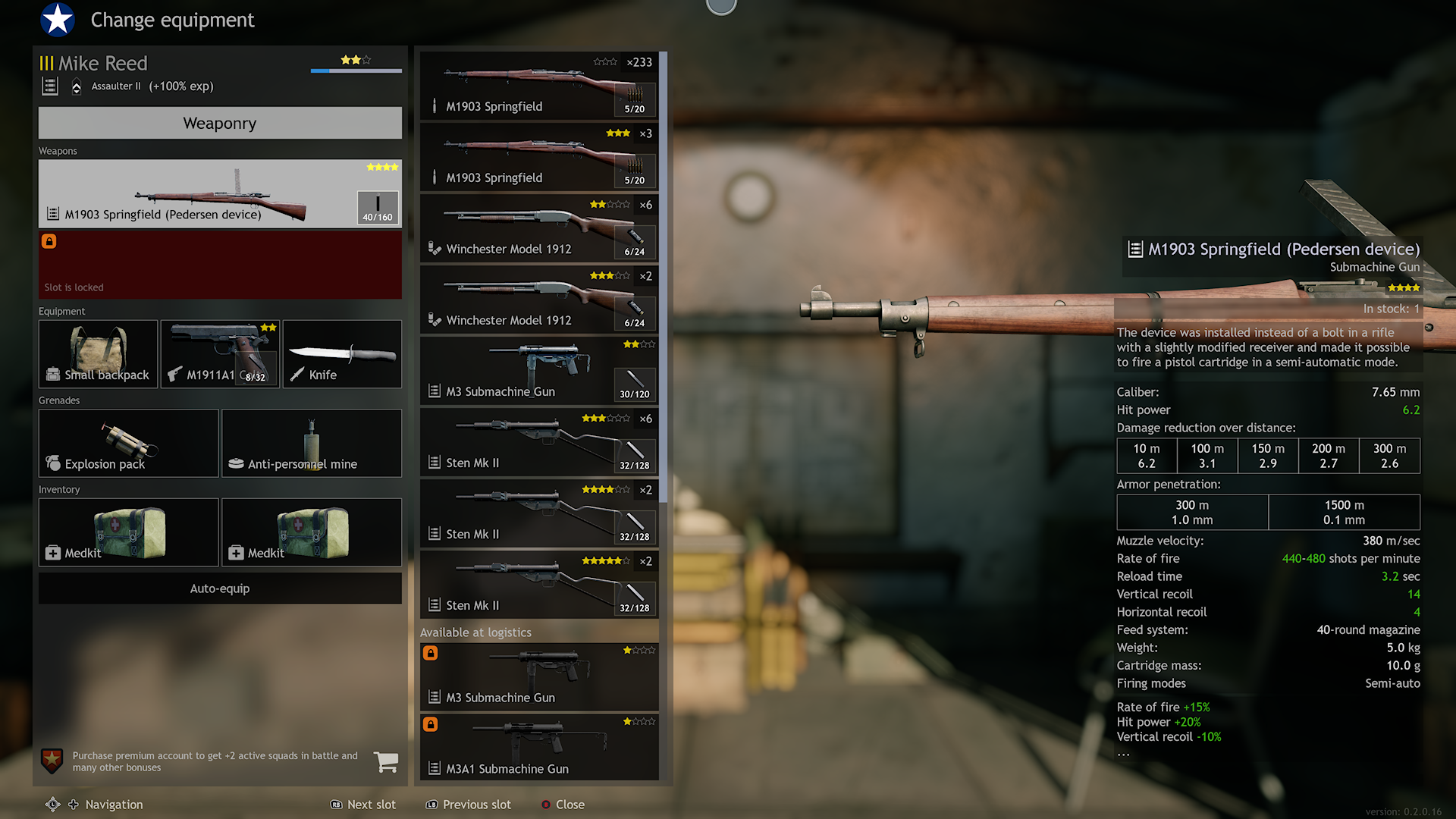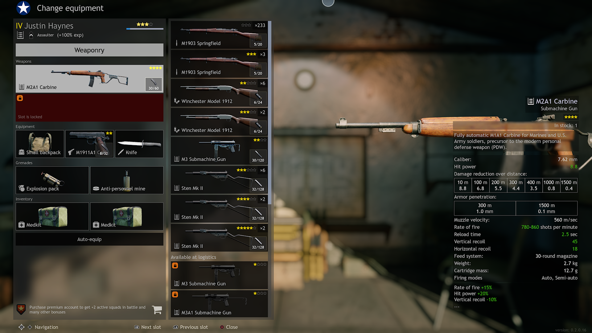 The M2A1 carbine is only available to assaulters even though the M2 carbine which is almost completely identical is available to all rifle supporting classes and is classified as SMG while the other as semi auto rifle for some reason.