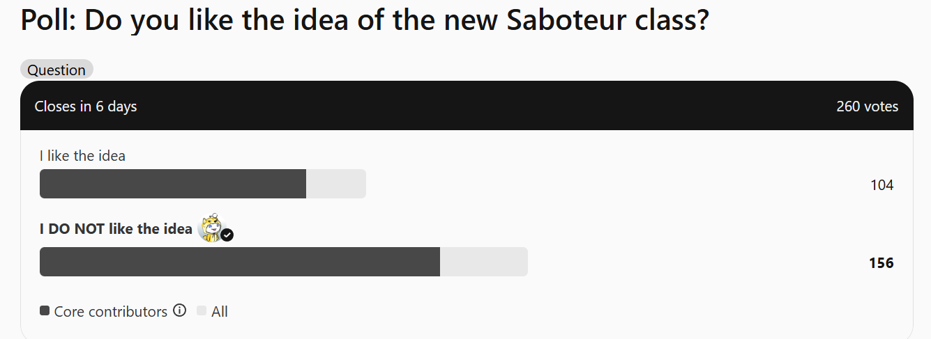 A clear majority of players do not want to see the saboteur class in the game.