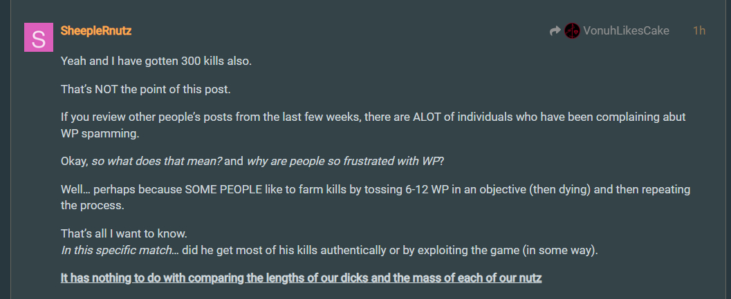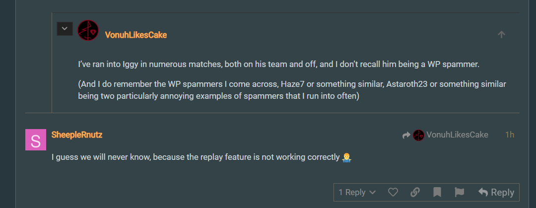 Or hear me out, if witnessed (assuming you’re a xbox user like I am) you use the capture (record) feature that can last from 30 seconds to 5 minutes and upload it on xbox (via captures or game captures why they didn’t call it recordings idk) and download either via phone or computer from the xbox app then post the evidence of WP spam. Way more reliable than the replay feature and is easier to use.