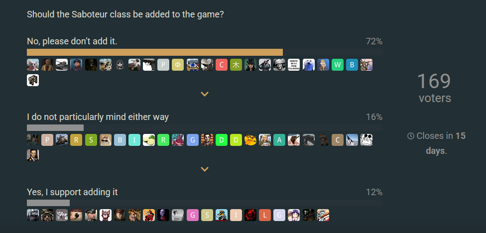 The only reddit poll that was used (and in favor) that I am awear off didnt even ask if you want the saboteurs or not but only if they are cool or not and wasnt even on the official enlisted reddit but the reddit of a youtuber.